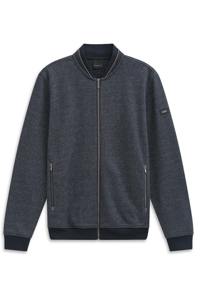 Gemêleerd vest van Bugatti met lange mouwen, ritssluiting, opstaande kraag, twee ritszakken, logolabel op de linkermouw en ribgebreide boorden.