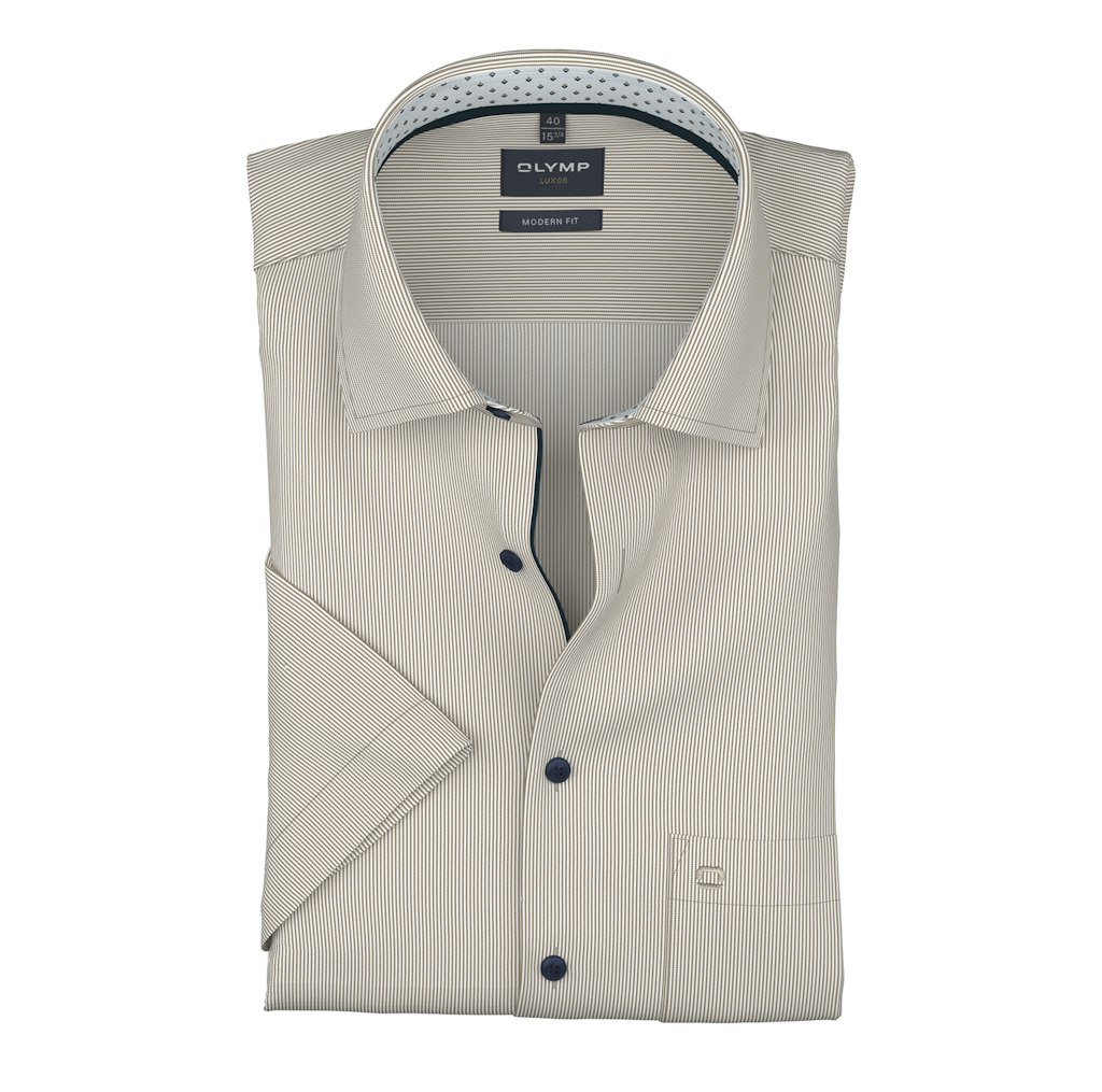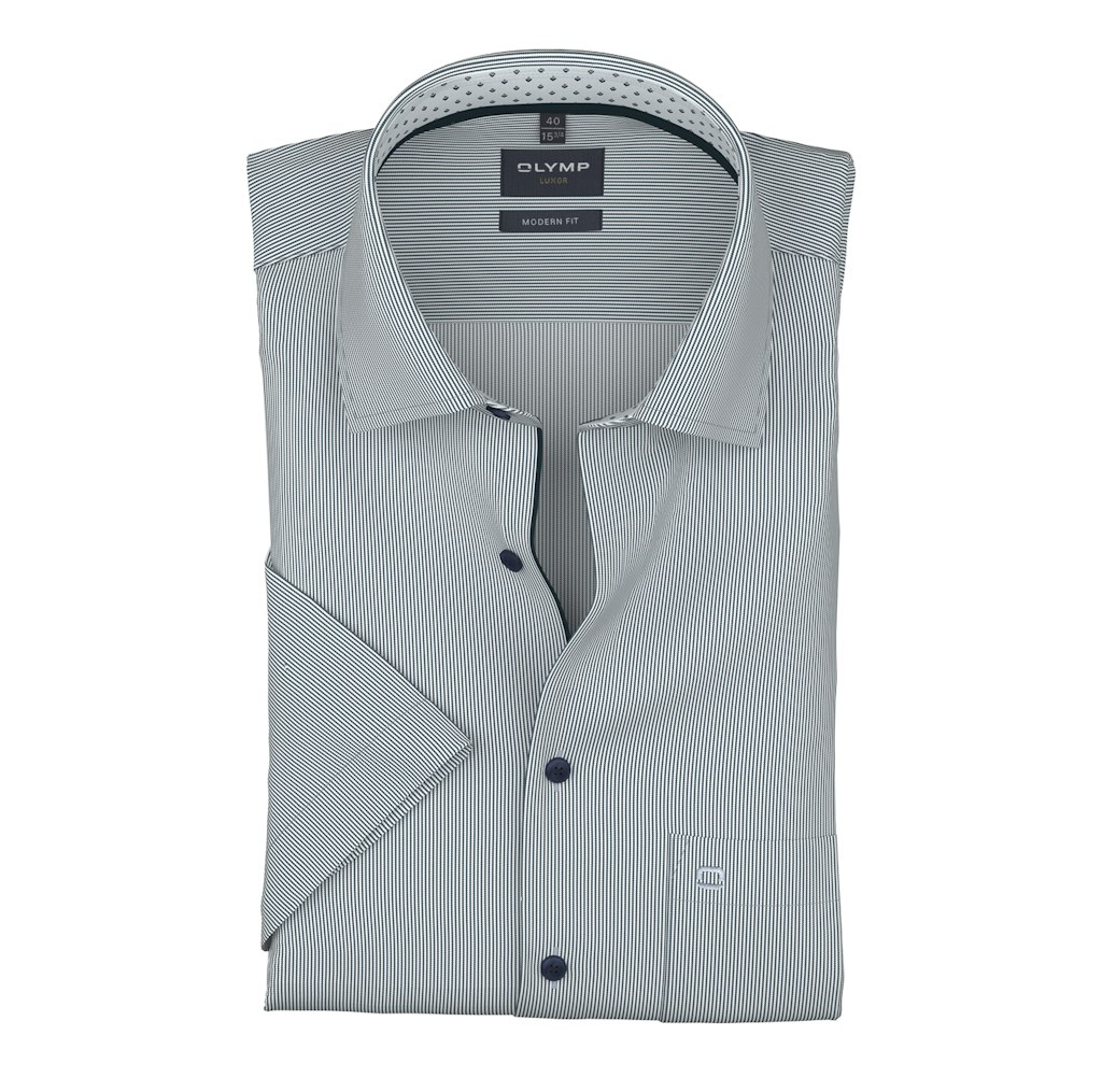 Modern fit overhemd van Olymp in een subtiel dessin met korte mouwen, kent kraag, knoopsluiting en een opgestikte borstzak voorzien van geborduurd logo.